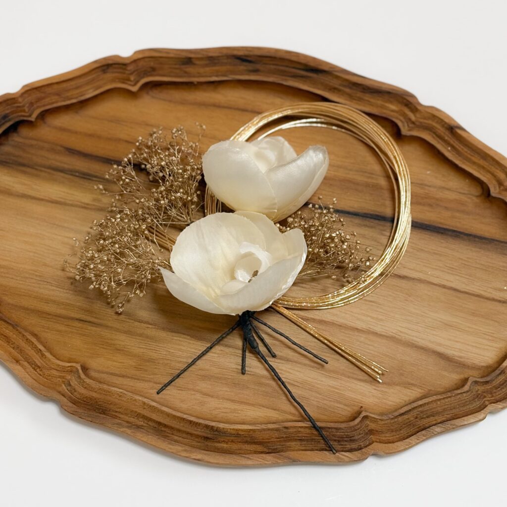 柔らかなアイボリーホワイトのお花と、ゴールドカラーのかすみ草や水引のサブパーツでまとめたスタイリッシュで品のあるセットです。