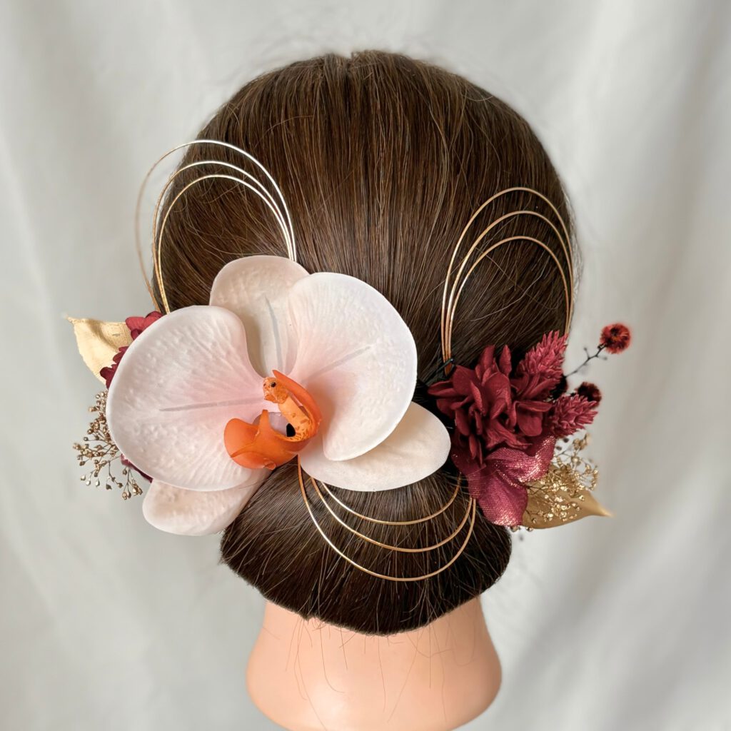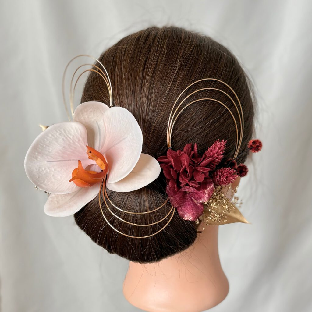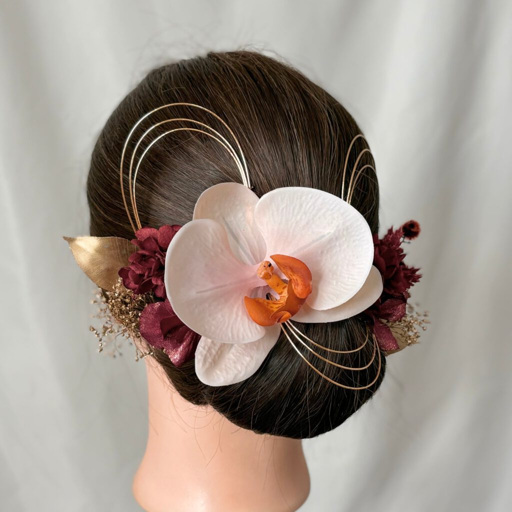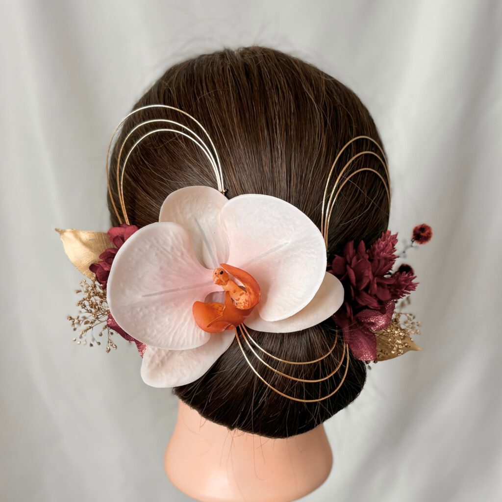 品のあるワイン、ボルドーカラーのパーツにゴールドがアクセントとなってヘアアレンジがさらに華やかに仕上がります。