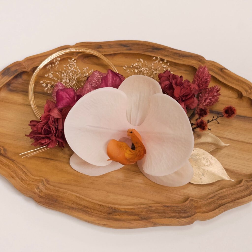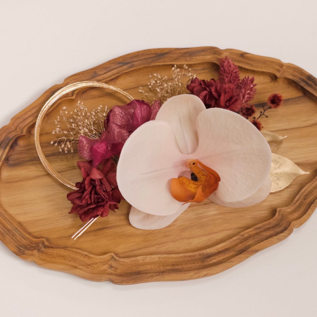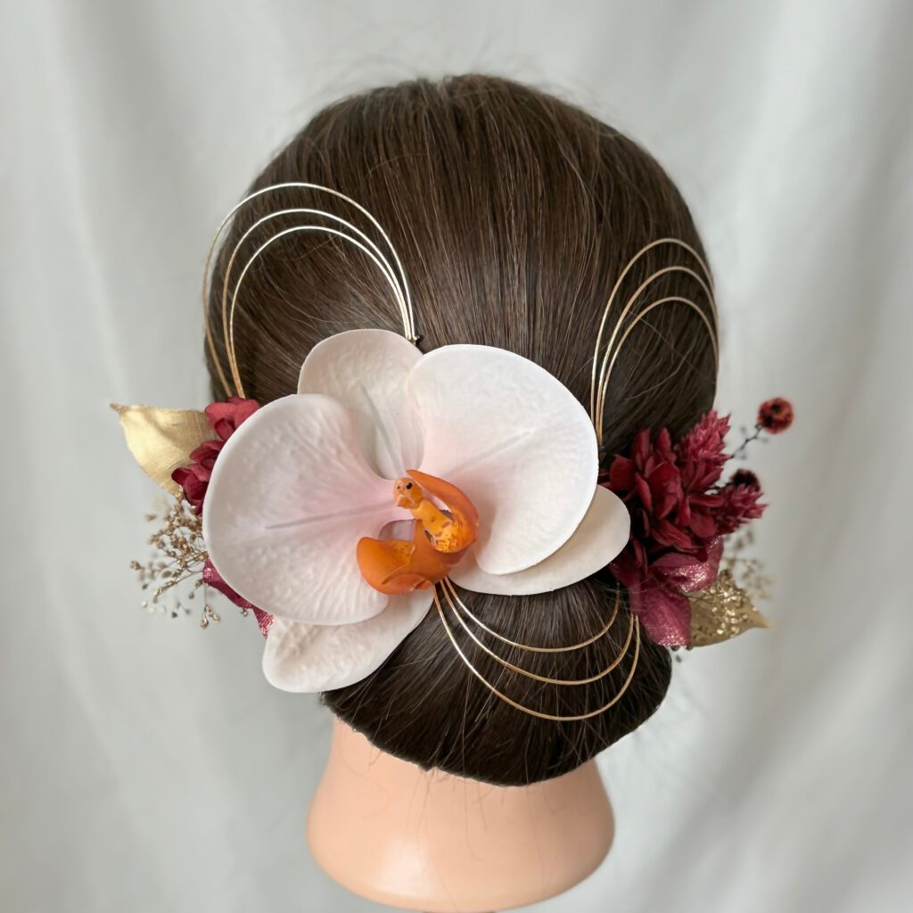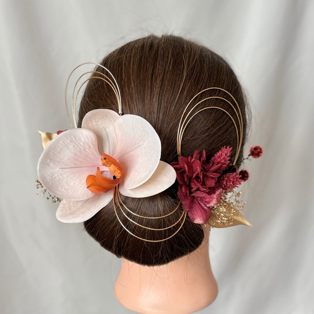 品のあるワイン、ボルドーカラーのパーツにゴールドがアクセントとなってヘアアレンジがさらに華やかに仕上がります。