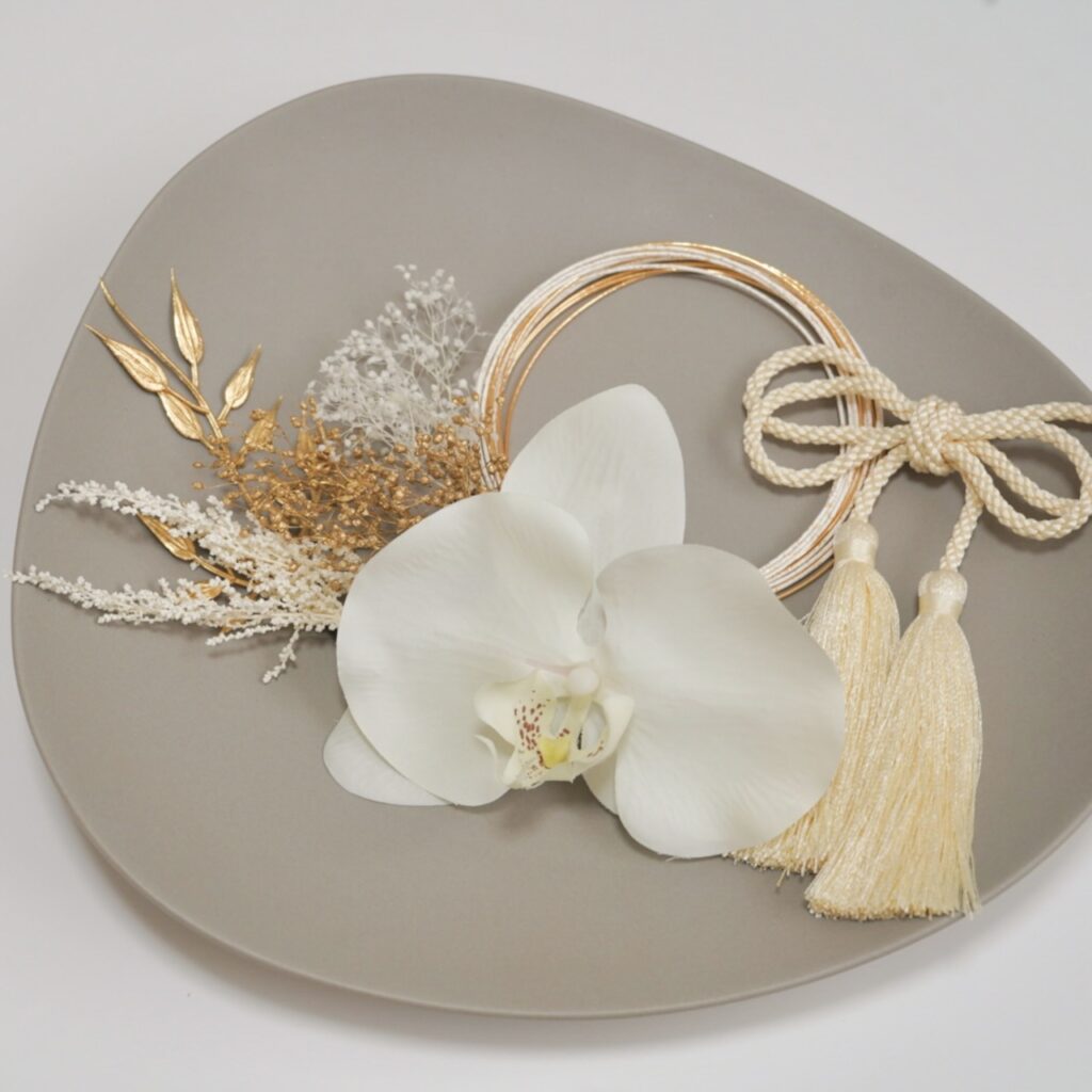 ホワイトとゴールドでまとめた、可憐な胡蝶蘭が目を惹くセットです。