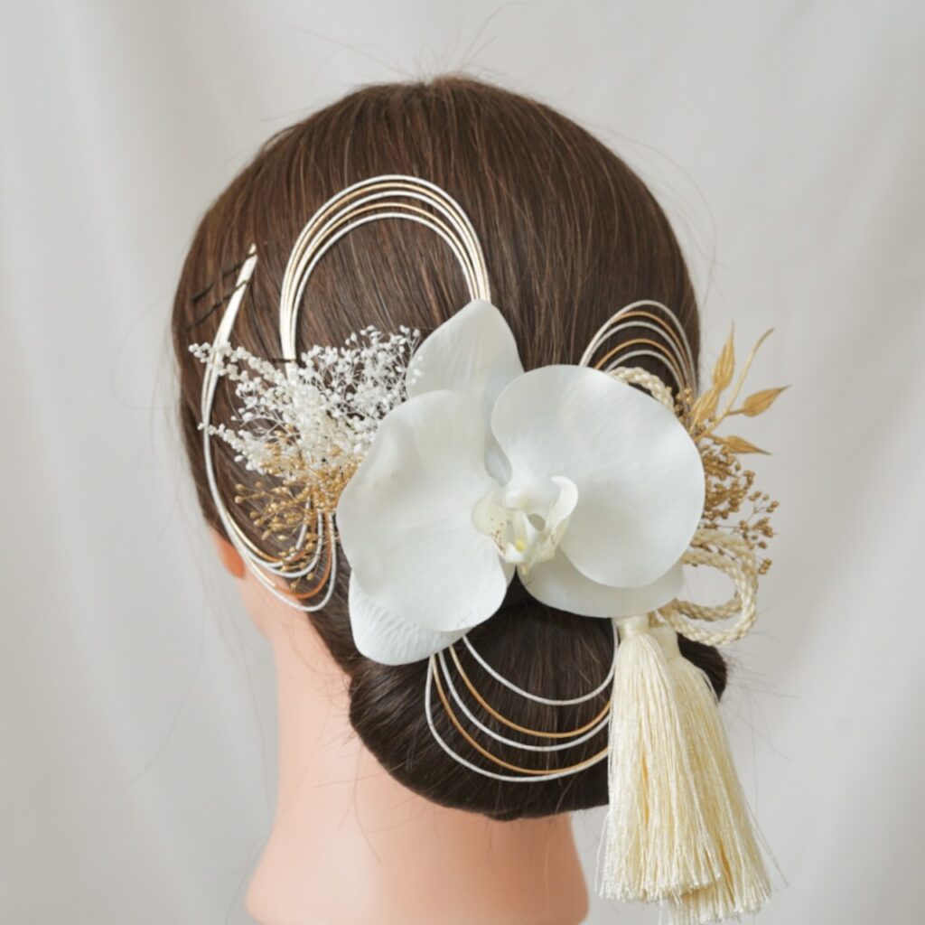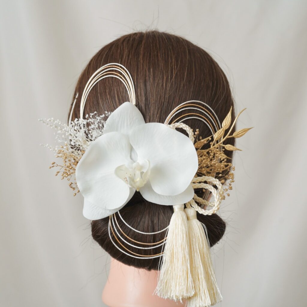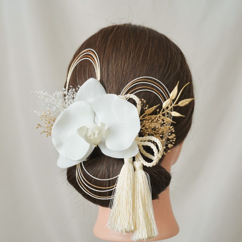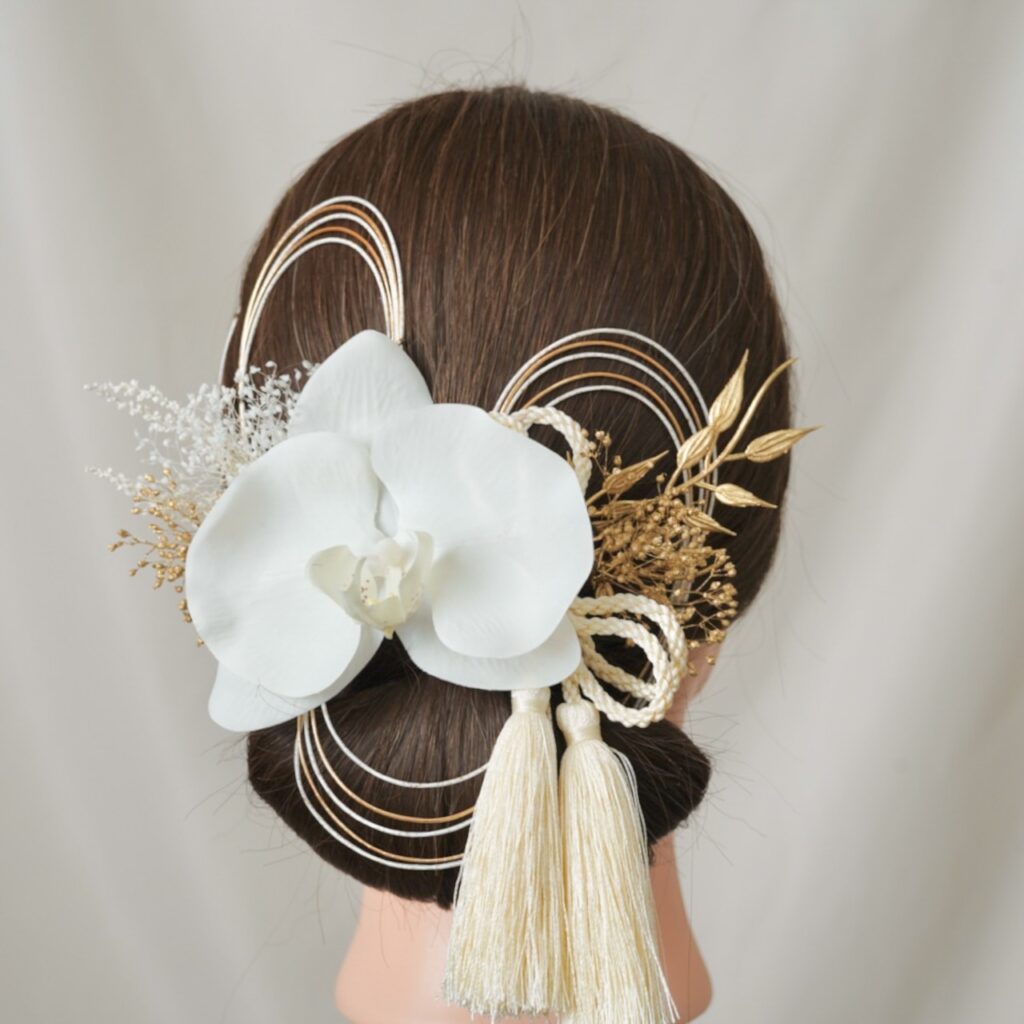 ホワイトとゴールドの組み合わせはどのような色味のお衣装でも喧嘩せず、合わせやすいカラーリングです。